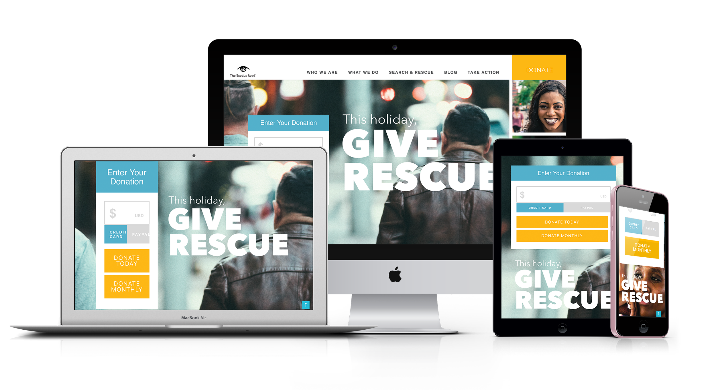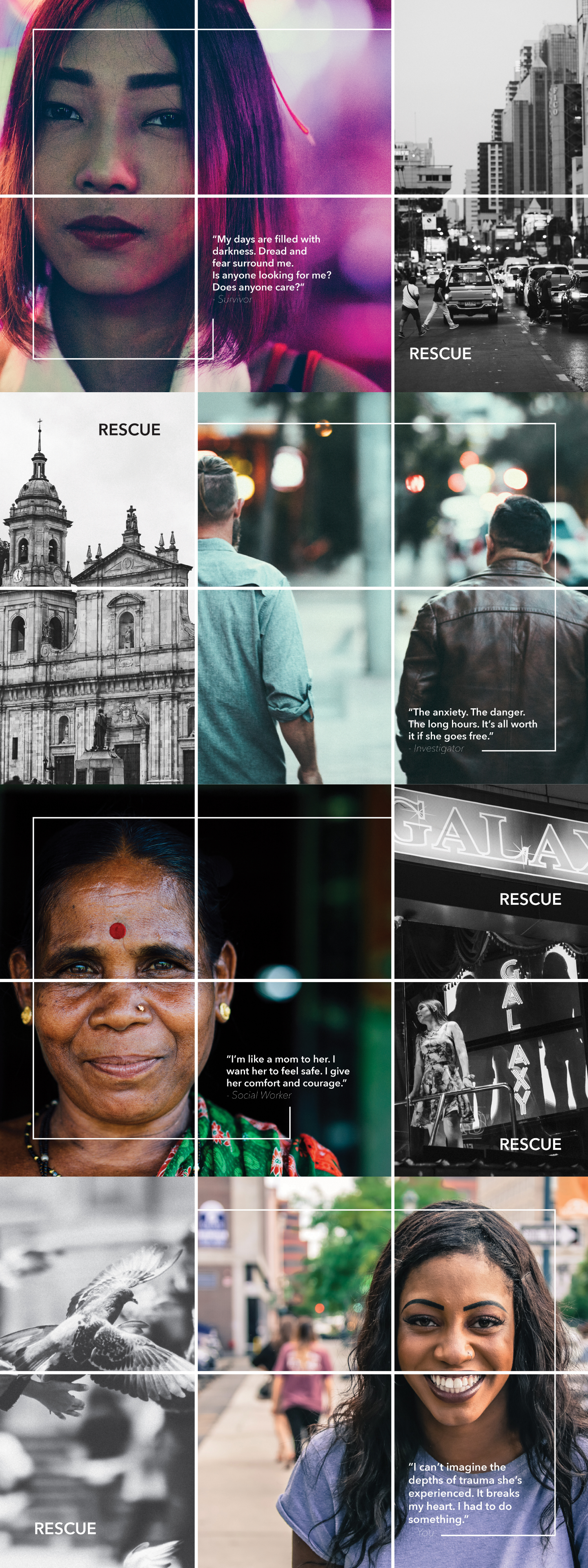 Human trafficking rescue involves a full cast of characters: the investigator, the social worker, the survivor, and the donor. When casting the vision for The Exodus Road’s EOY fundraising campaign, my team chose to highlight these unique perspectives, making their stories the heartbeat of both messaging and visuals. As design lead on this project, my job was to visually weave these narratives throughout the various touchpoints of the campaign. I used bold typography and vibrant imagery to bring donors to the front lines and encourage them to “Give Rescue” over the holidays.