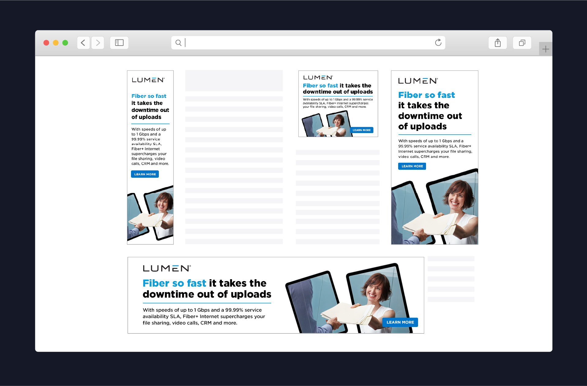 In 2021, I was paired up with a copywriter to create a concept for our Fiber+ campaign, with an emphasis on “fast” internet. We chose to show how “fast” internet can create seamless connections between devices, bringing an IRL flavor to virtual business. Once we locked in our idea, I tackled visuals by masking scenes of people working together within two separate devices. Through strategic choice of imagery and careful masking, I highlighted the human interaction and positioned the technology as a supporting element. My objective here was to show the customer outcome that this campaign promised—an approach that resonated strongly with our audience and thus became the official direction for this two-year campaign.